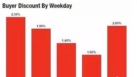 此外,RealtyTrac还发现,周一是购买房子的最佳日子,这一天平均折扣为2.3%。周五次之,折扣2%。而周二是最不宜买房的日子,这一天最多只有1%的折扣。